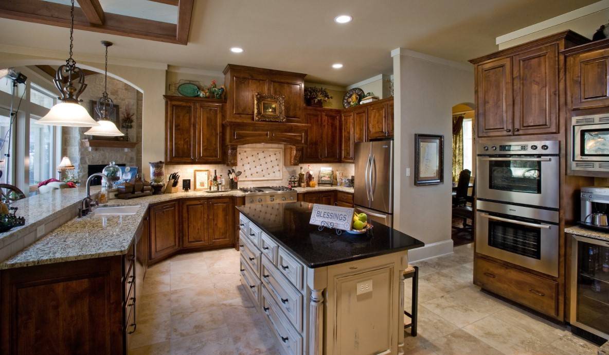 Цвет фасадов и столешниц необязательно должен быть однотонным. В одном гарнитуре может быть удачно подобран темный (орех или дуб) и светлый (сосна, бук) материал. Однако следует учесть, что чем светлее мебель, тем стертее грань между кантри и провансом. Эти кухонные стили имеют небольшие отличия, но все-таки очень пересекаются между собой.