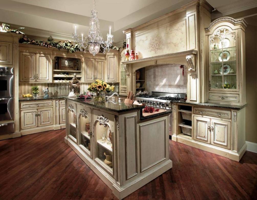 Украсить кухню можно хрусталем и картинами в массивных рамах, большими светильниками и различными произведениями искусства.