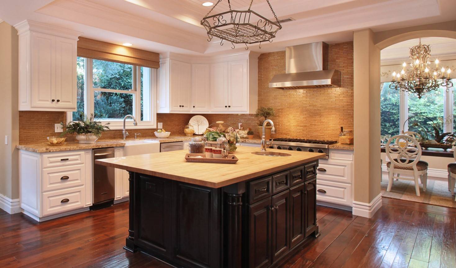 Цвет фасадов и столешниц необязательно должен быть однотонным. В одном гарнитуре может быть удачно подобран темный (орех или дуб) и светлый (сосна, бук) материал. Однако следует учесть, что чем светлее мебель, тем стертее грань между кантри и провансом. Эти кухонные стили имеют небольшие отличия, но все-таки очень пересекаются между собой.