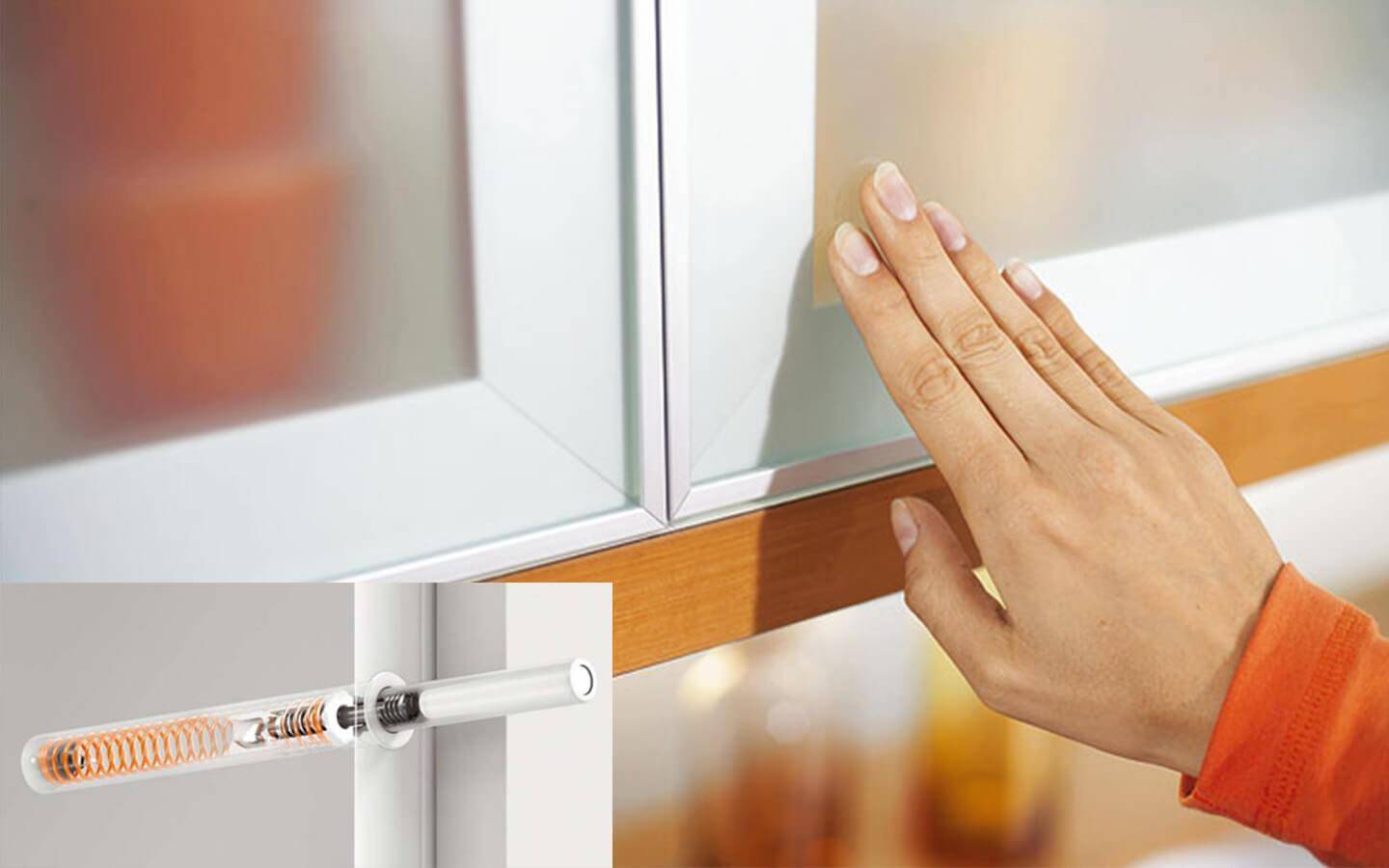 В основе работы механизма лежит система блокировки/разблокировки клапана, что заставляет пружину либо выталкивать дверцу, либо закрывать её. Сам механизм, а именно толкатели, могут иметь разный ход. Изначально имеется перемещение 10-45 мм, его можно отрегулировать. Чаще всего ход толкателя устанавливается на значение 40-45 мм. При этом лучше выбрать толкатель, на конце которого установлен магнит, который служит дополнительным держателем фасада. Для мягкости и бесшумности, производители выпускают прорезиненные наконечники, что тоже нашло своё применение на кухне.