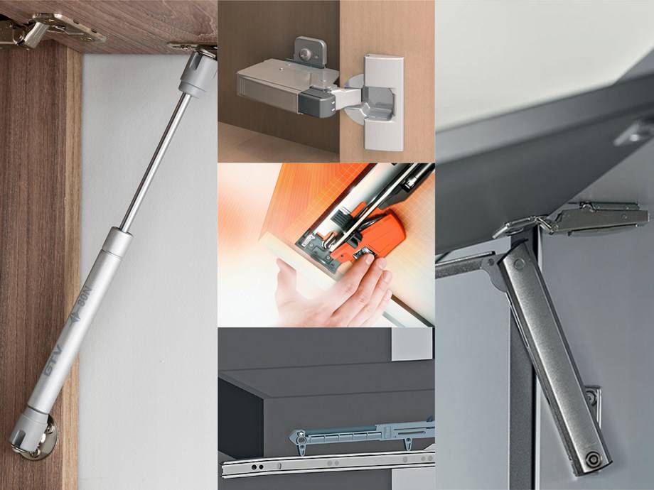 - Механизмы для поднимания дверок. Используются для кухонь c навесными полочками полочек с дверцами.