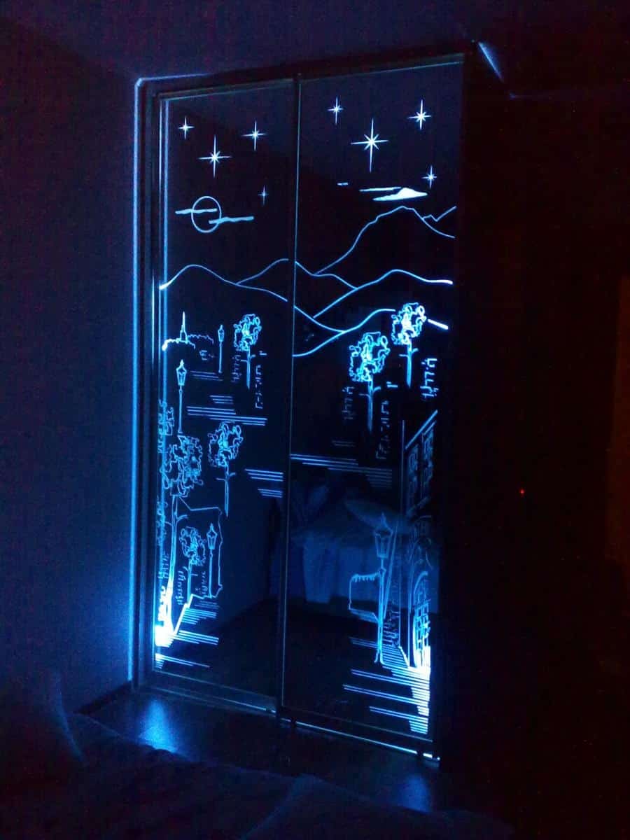 Еще одним вариантом внешней подсветки для шкафа является выделение контуров рисунка на стеклянных дверях.