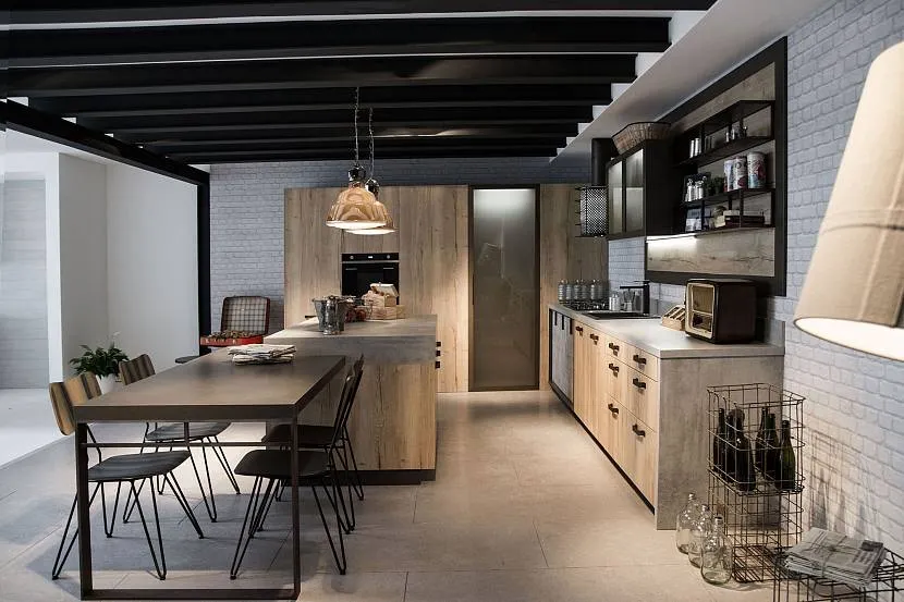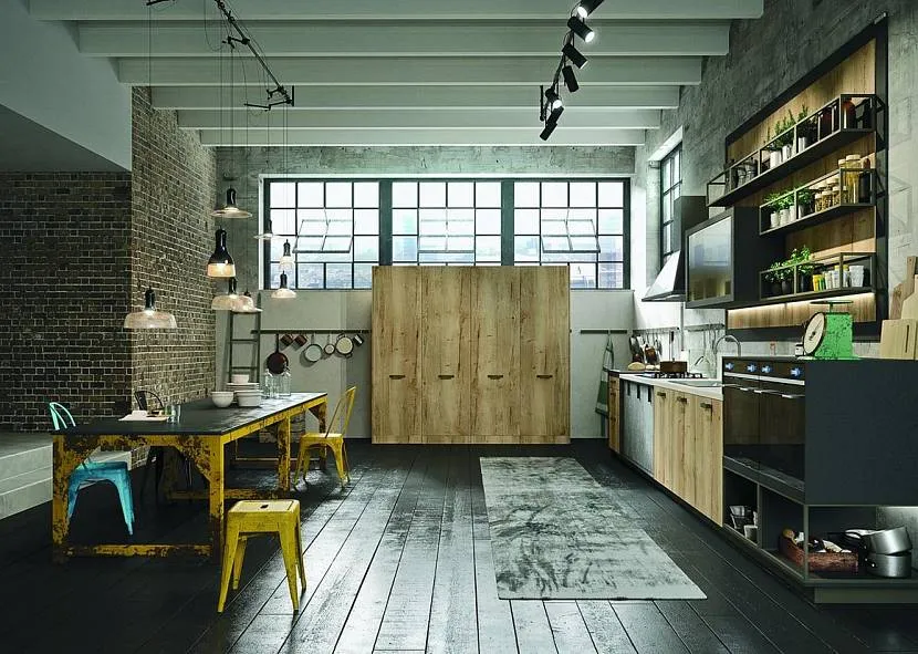 Стол в стиле лофт на кухне должен привлекать максимум внимания. В духе заявленного интерьера обеденная зона делается массивной и нестандартной. Например, в просторную кухню впишется гарнитур на больших кованных ножках. Причем поверхность столешницы должна быть изготовлена из дерева. Такие модели столов лучше поставить у стены. Если же выбор падает на овальные варианты мебели, тогда их следует расположить в центре комнаты, сформировав отдельно стоящую обеденную зону.