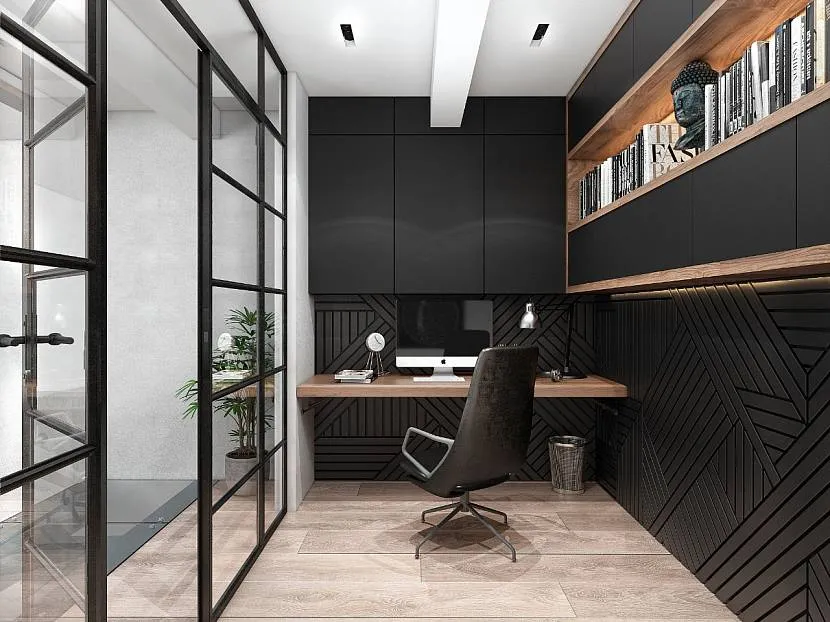 В рабочее помещение стоит выбирать варианты с достаточной функциональностью. Конструкция преимущественно массивная, имеет оригинальную форму. В нижней части принято обустраивать конструкции для хранения, сооружать дополнительные стеллажи, если они не предусмотрены изготовителем.
