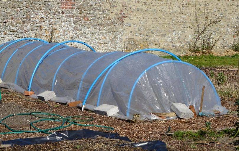 - Вариации: каркас можно заменить пластиковыми трубами, а укрывной материал — плёнкой.
