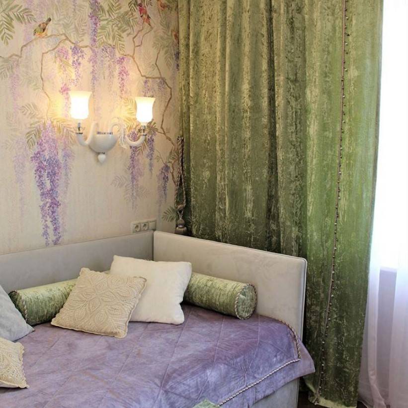 Преображает помещение до неузнаваемости и добавляет в него позитива и свежести. Розовые или лиловые бархатные занавески, позволят создать самые оригинальные шторные комбинации.