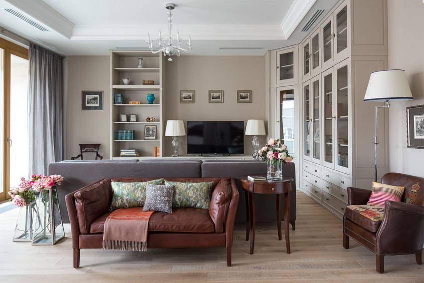 В современных гостиных не принято ставить большие вещевые шкафы — для хранения одежды и белья существуют удобные купе, установленные в прихожей, если место позволяет, или в спальне. При возможности для хранения одежды и обуви обустраивают целые гардеробные. В гостиной же принято оставлять небольшие книжные стеллажи, тумбы для телевизионной техники, навесные полочки — всё это не стесняет пространство и не перегружает интерьер.