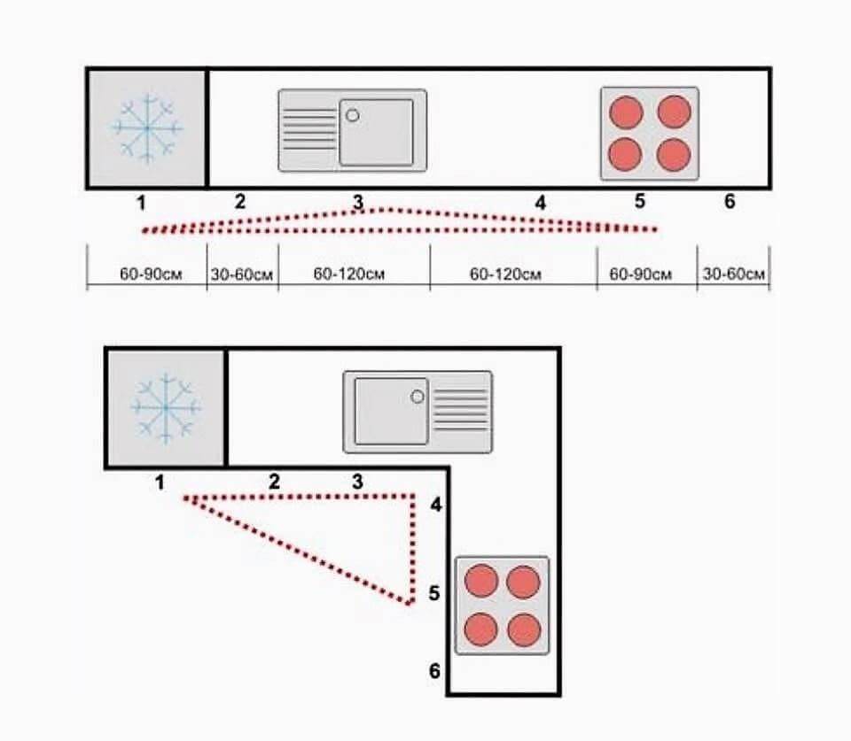 Перенести в другое место розетку под холодильник довольно просто, а вот согласовать во всех инстанциях проект для перемещения газовой плиты — уже сложнее. Поэтому, при расстановке кухонных приборов, не всегда получается придерживаться правила «эргономического треугольника». Особо переживать по этому поводу не стоит, гораздо важнее соблюсти иные правила: