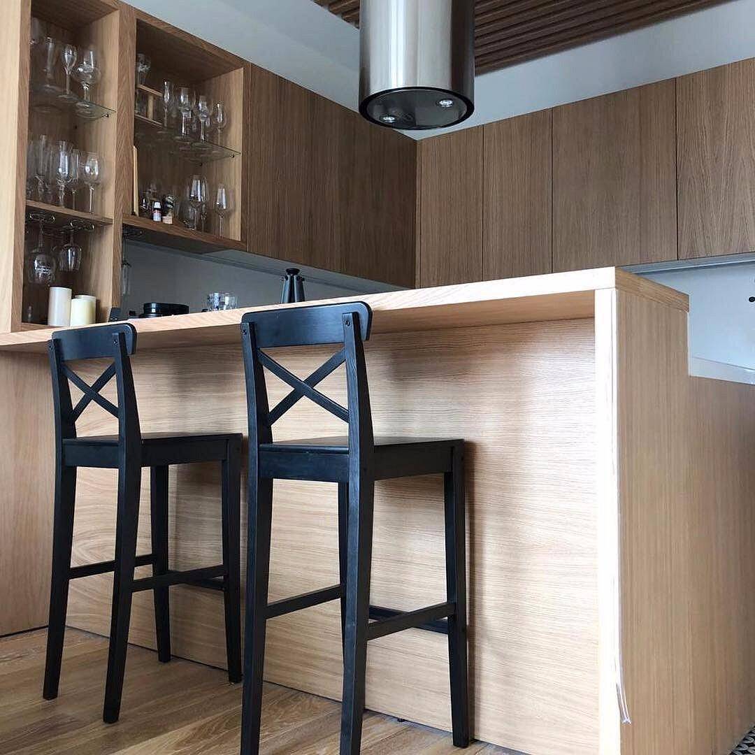 - Барная стойка в тесной кухне удачно справится с ролью стола. А в полые ниши под столешницей можно разместить мини-холодильник или скрытый шкаф.