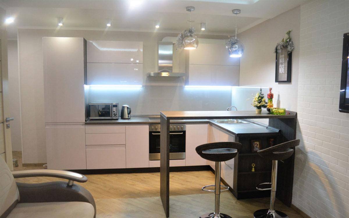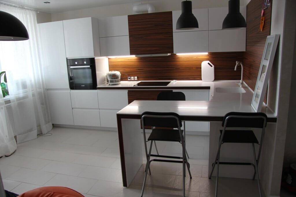 Это идеальный вариант экономии пространства. Органично смотрится сочетание стойки и прямого кухонного гарнитура. Конструкцию особенно оценят энергичные люди, которые немного времени проводят на кухне.