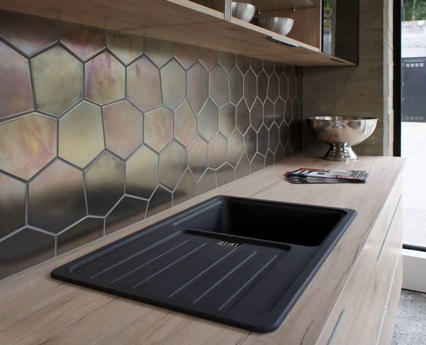 Металлическая мозаика, конечно, не изготавливается полностью из металла, иначе она была бы слишком тяжелой для стены. Обычно это керамика, резина или пластик, покрытые слоем нержавейки, латуни или бронзы. Такое покрытие позволяет имитировать золото и сталь. Такой мозаичный фартук практичен и прочен, но у него есть один минус — металлическое покрытие склонно истираться со временем.
