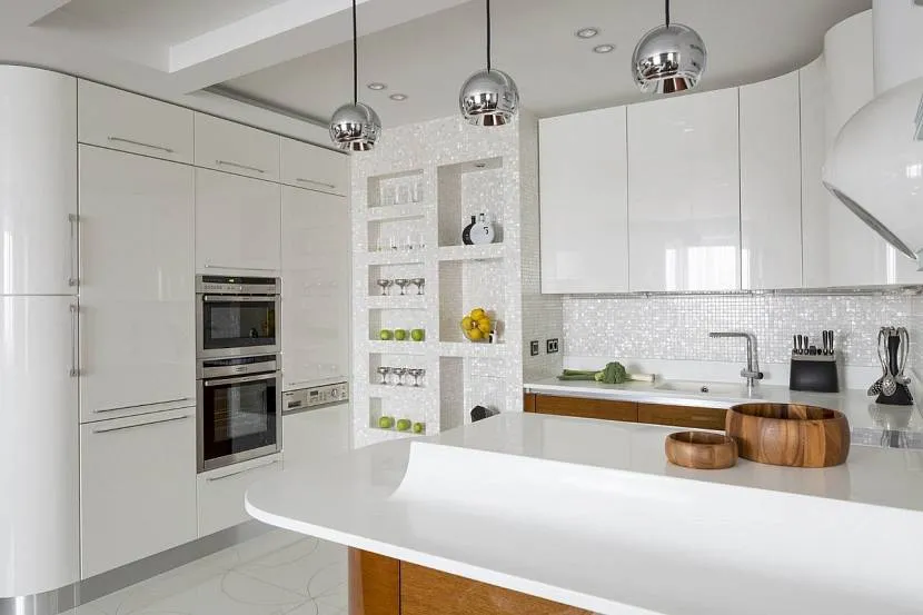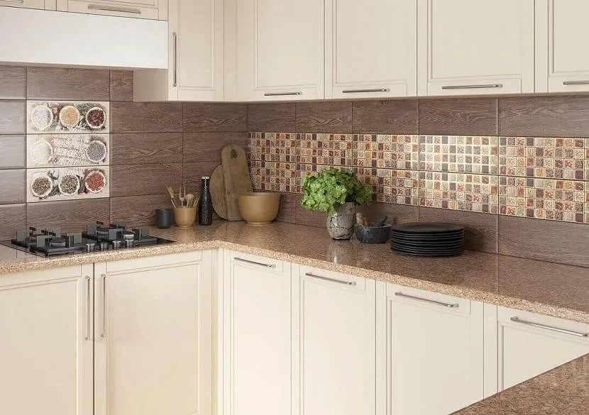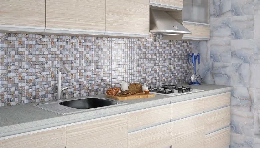 - ;Использование мозаики для фартука или керамической плитки для столешницы – оптимальное решение. Этот материал не боится ни жира, ни перепадов температур, легко поддается чистке любыми моющими средствами.