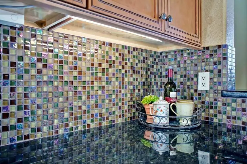 - большой выбор — мозаика отличается не только по цвету, но и по размеру, и даже форме. Это позволит создать уникальные композиции и добавить кухне стиля и оригинальности;