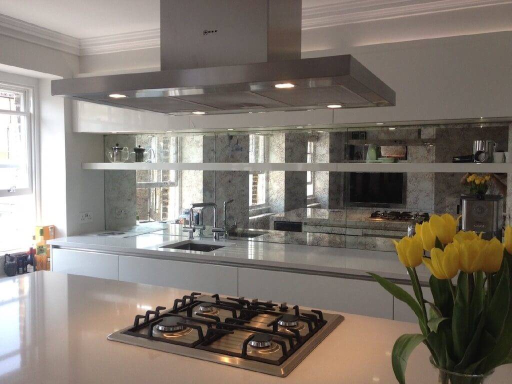 - Мозаика из зеркальных элементов может стать оригинальным акцентом кухни, оформленной в стиле хай-тек. Если укладывать кусочки зеркал по диагонали, происходит оптическое расширение пространства. Мелкие зеркальные тессеры визуально увеличивают ширину рабочей стены.