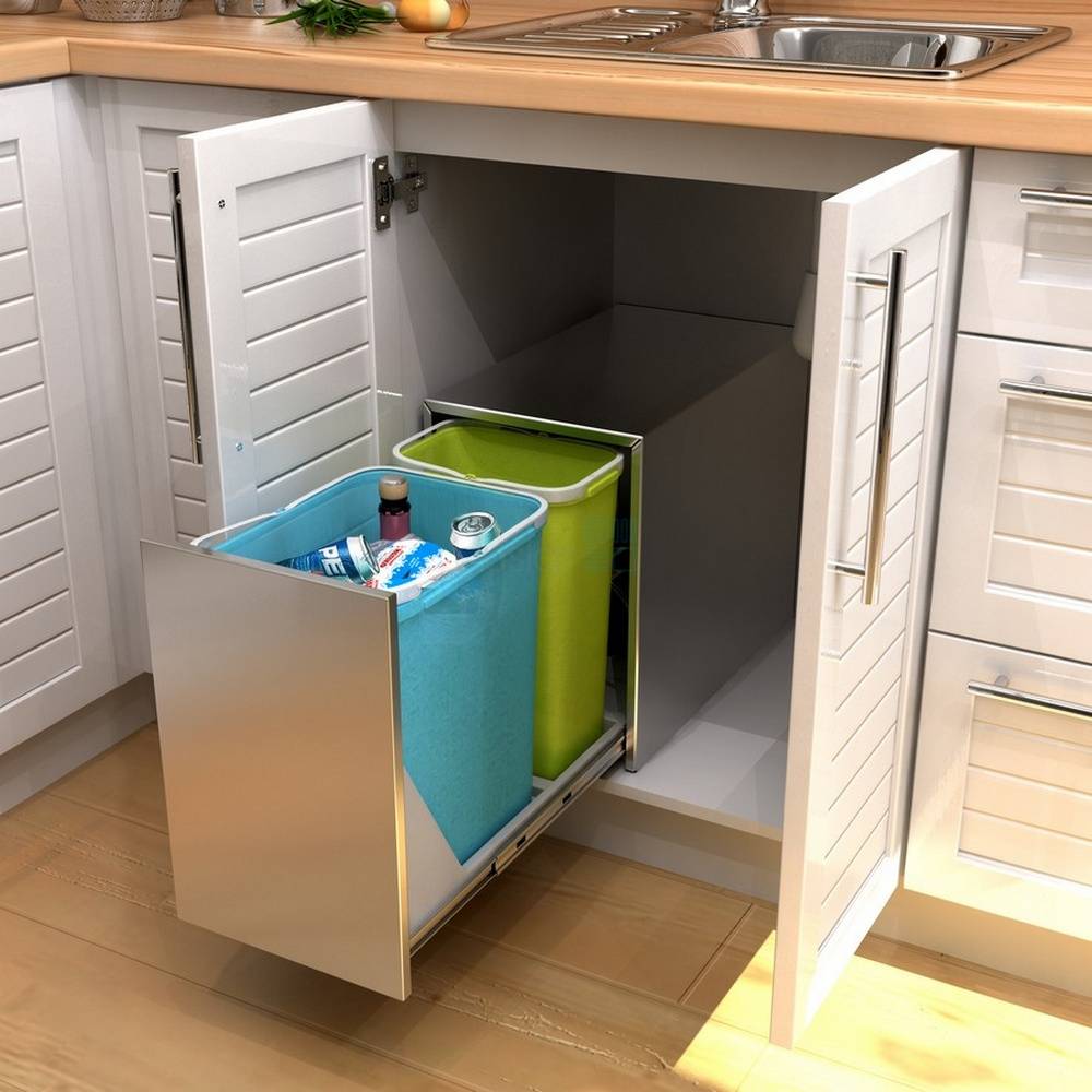 Выдвижное мусорное ведро для кухни на направляющих. Удобный вариант, который встраивается в нижние тумбы кухонного гарнитура. Благодаря направляющим при открывании дверцы система с мусорными емкостями «выезжает», а когда сор выброшен, достаточно легкого нажатия, чтобы мусоросборники «заехали» назад в тумбу. Система может быть узкой (например, располагаться вместо карго для бутылок) или широкой, с крышкой или без нее, содержать контейнеры в одном ряду или в два яруса. К слову, по поводу крышки – есть модели емкостей, которые выезжают без крышки, а когда возвращаются на свое законное место, заезжают в аккурат под крышку. Это одновременно и гигиенично, и удобно.