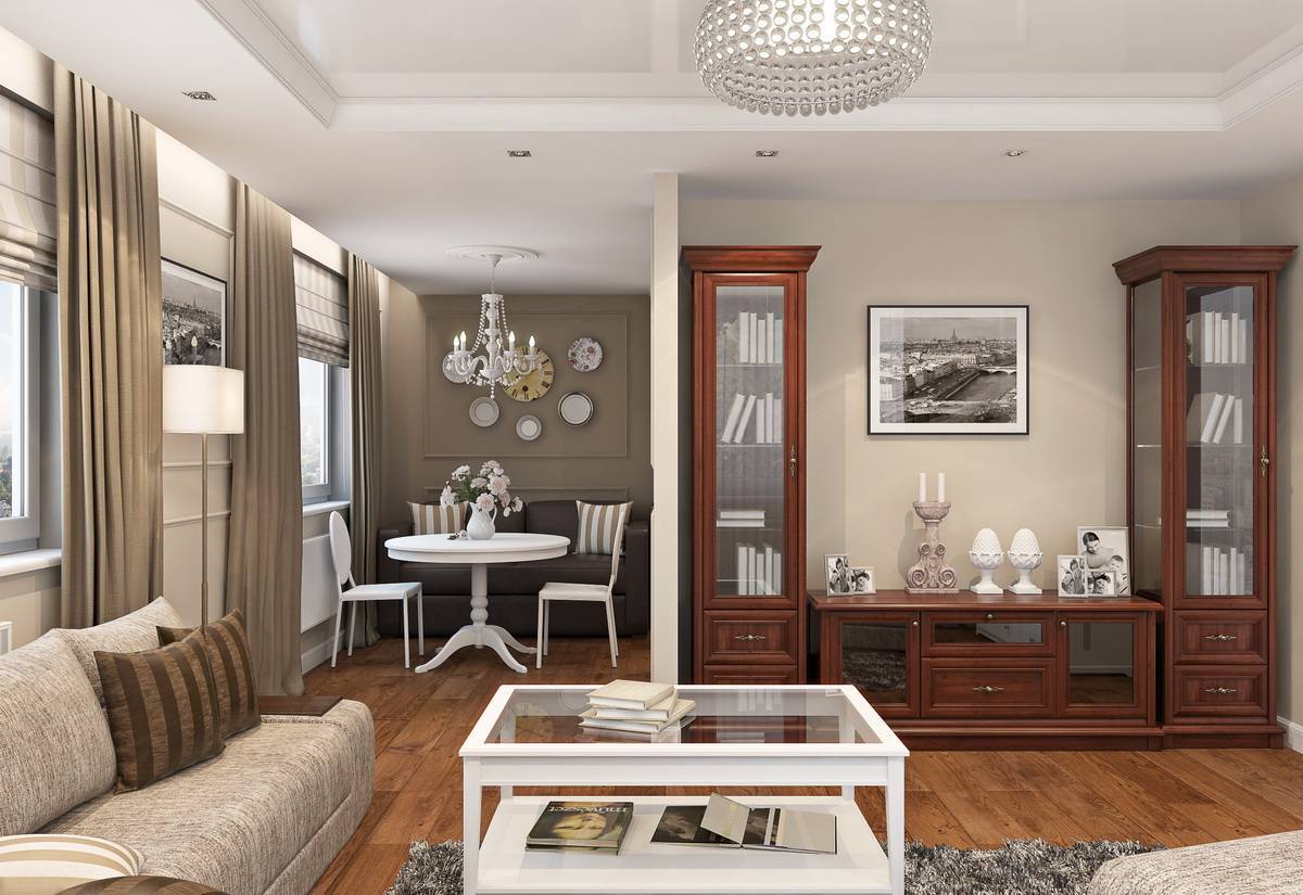 - Предполагаемого функционала. Комплект предметов интерьера зависит от того, сколько человек и как планируют использовать данное помещение в квартире. Одного небольшого дивана недостаточно для большой семьи или частых посиделок с друзьями, например. Если вы любите книги — поставьте книжный шкаф, время от времени устраиваете званые ужины — обеденный стол и стулья.