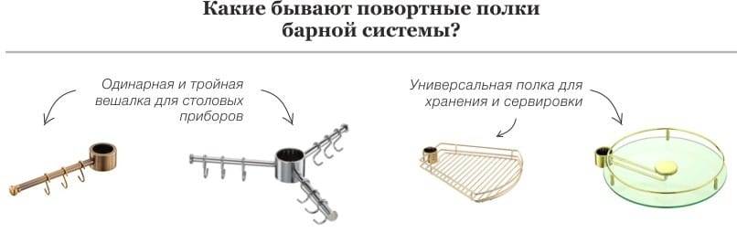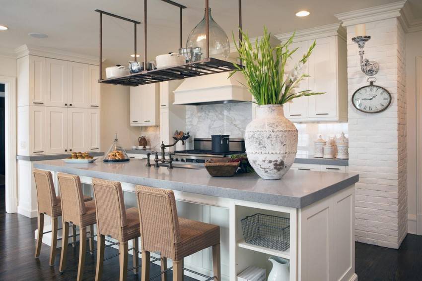 Два последний варианта не предусматривают большого нагромождения фурнитуры, поэтому лучше остановиться на 1−2 полочках. Для завтраков обязательно следует расположить кружки, фруктовницу, корзинку для сладостей, а также не помешают крючки для приборов. Стойка для вечеринок выглядит шикарнее всех. Тут обязательно есть все перечисленные держатели, а также добавляется подставка под бутылки, бокалы. Иногда они могут крепиться не к пилону, а к верхней подвесной конструкции, располагающейся под потолком.