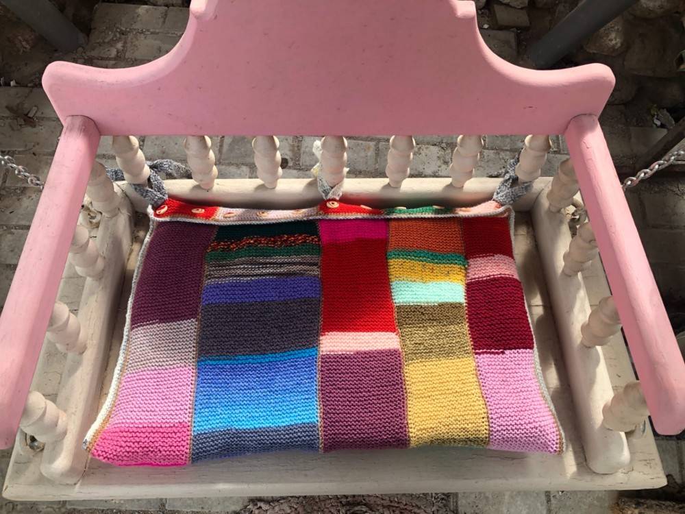В примере показана вязаная сидушка спицами из остатков пряжи. Сидение качелей: 65х45 сантиметров. Значит мягкая подушка должна быть на 1 – 2 см меньше. Я связала несколько полос и соединила их. Готовое полотно = 130 х 85. На одной стороне будут пуговицы, значит вторая сторона должна накидываться на чехол, чтобы эти пуговицы без труда застегивались. Сшила по двум сторонам. Третья сторона – сгиб сидушки. А 4-я – пуговицы и разрезы для них. Связала спицами три веревочки, шириной 5 см и длиной 50 см. Пришила их к сидушке. Отдельно вручную сшила подушку того же размера, положив внутрь синтепон.