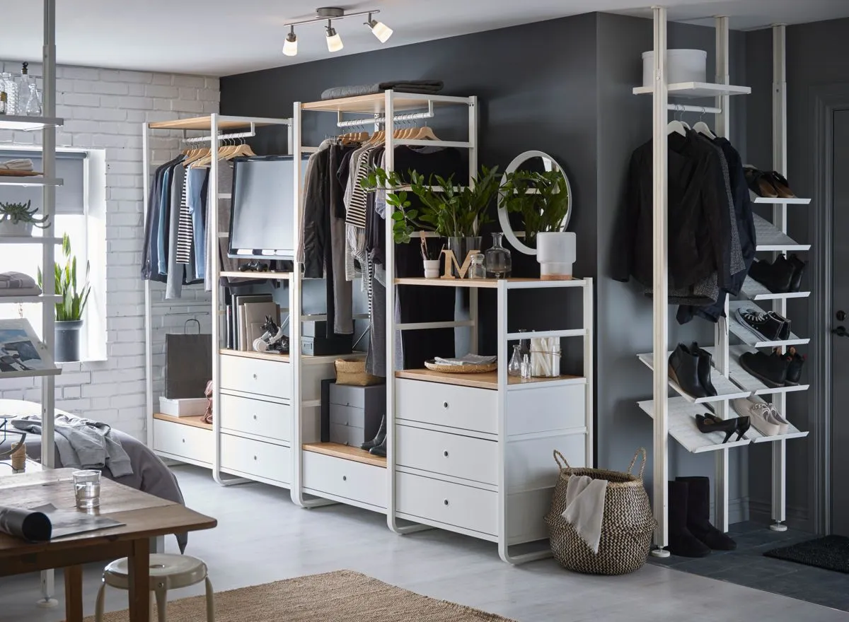 Ассортимент шкафов настолько разнообразен, что трудно не запутаться в комбинациях полочек, отделений для вешалок и размещения в пространстве. К тому же в любой момент можно дополнительно приобрести новые элементы для уже установленных и используемых шкафов или и вовсе перестроить всю конструкцию изменяя расположение отделов, дополняя и меняя местами детали. Поэтому для большинства людей, приобретающих шкафы IKEA главное преимущество — это способность освежить интерьер, не меняя при этом конструкцию полностью.