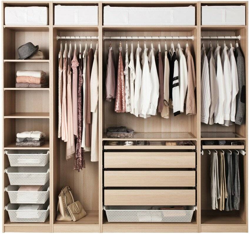 Большим спросом за последнее время стали позываться шкафы гардеробной системы «Пакс» — такие предметы мебели предназначены под хранение одежды любого типа. Система имеет несколько составных частей, которые можно будет разместить в любом порядке по собственному желанию. Так, для своих покупателей производитель Икеа выпускает шкафы следующих параметров: