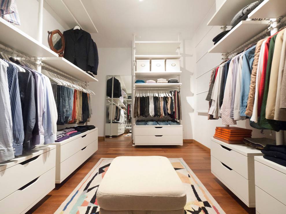 Хозяйственные принадлежности лучше скрыть от глаз за дверью в специальных вместительных секциях. Они часто бывают неприглядными и могут испортить внешний вид гардеробной. Идеальная гардеробная комната также имеет зеркала: одно в полный рост, размещенное на двери шкафа или стене, и одно мобильное, которое будет стоять отдельно. При наличии места желателен пуф или скамья.