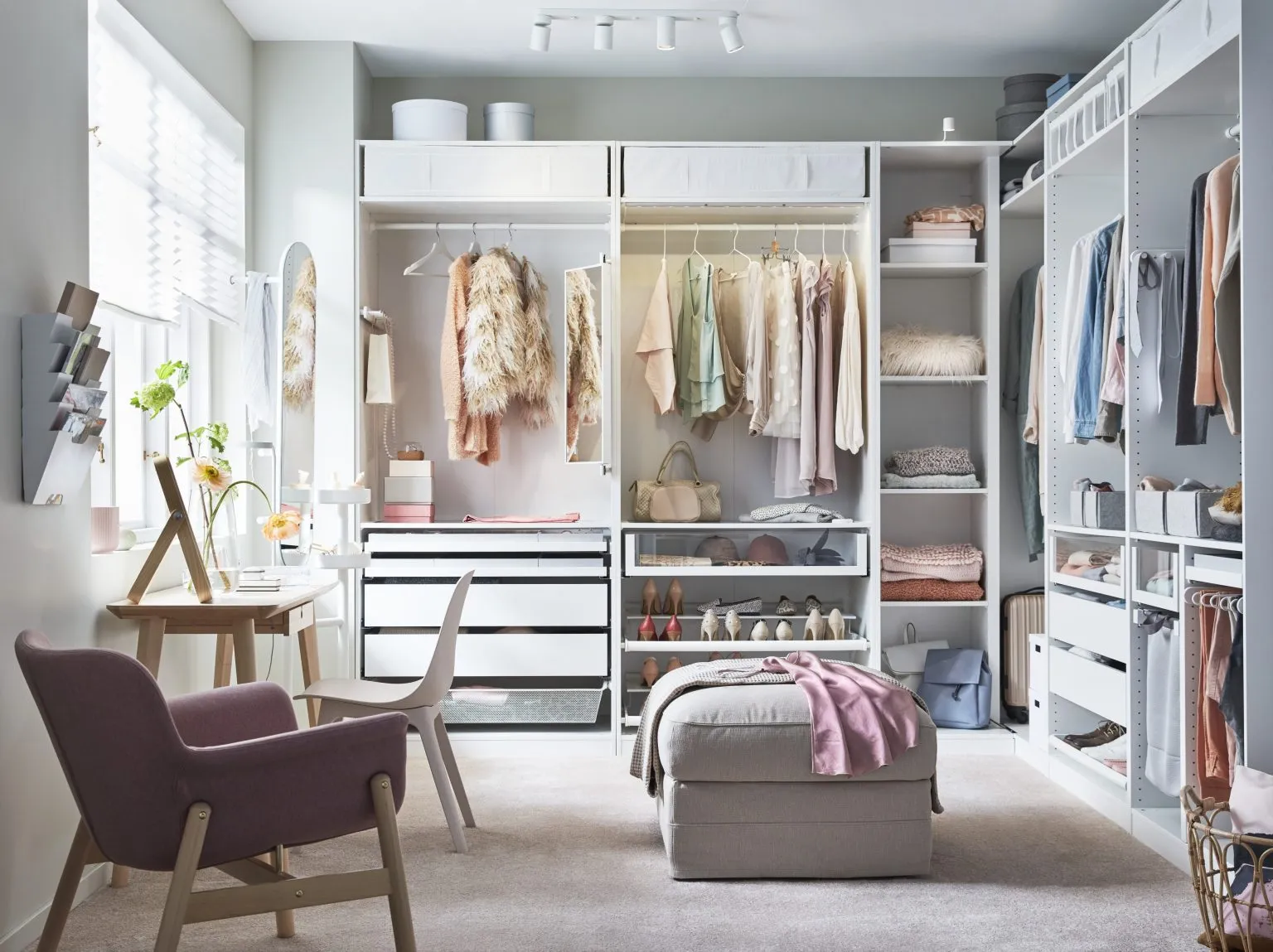 Шкафы IKEA помогут избежать массивных нагромождений в комнатах отдыха. Можно выбрать компактную модель с хорошей вместительностью или приобрести встроенную гардеробную систему, которая заполнит нишевое пространство.