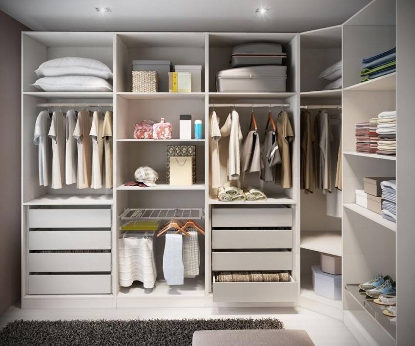 Любая гардеробная обязательно должна включать открытые полочки, выдвижные шкафчики и место для хранения обуви