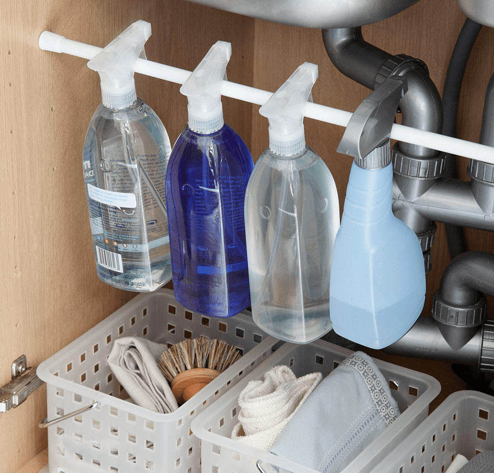Вместо контейнеров встройте ноу-хау в виде пластиковой штанги, которая продаётся в IKEA всего за 200 рублей. На неё повесьте спреи и распылители.