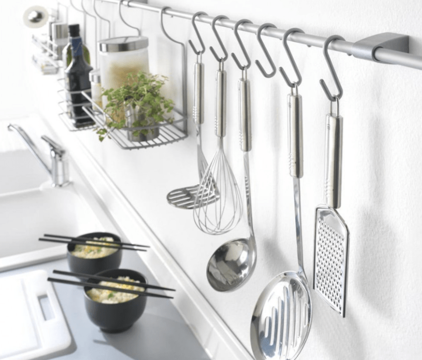 - Рейлинги. Это металлические трубки, на которые подвешивают баночки со специями и предметы утвари.