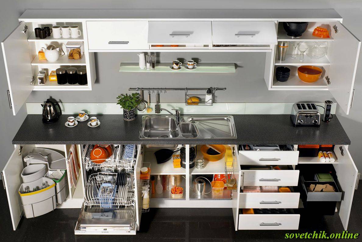 Рассматривая наполнение кухонных шкафов, стоит сопоставить предлагаемые варианты с личными потребностями и расположением мебельного гарнитура на кухне. Сегодня в арсенале производителей представлены следующие типы наполнения: