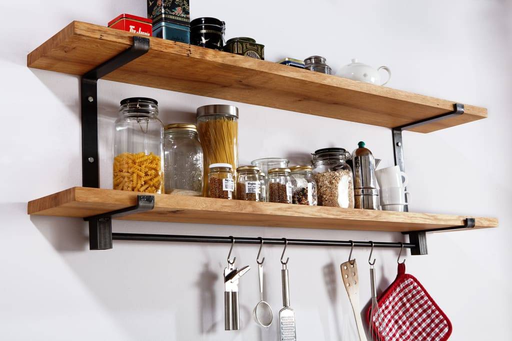 Открытые полки не имеют фасада. Чаще всего навесные. Считаются заменой шкафчиков и позволяют не только расположить посуду, но и эффектно дополнить интерьер кухни.