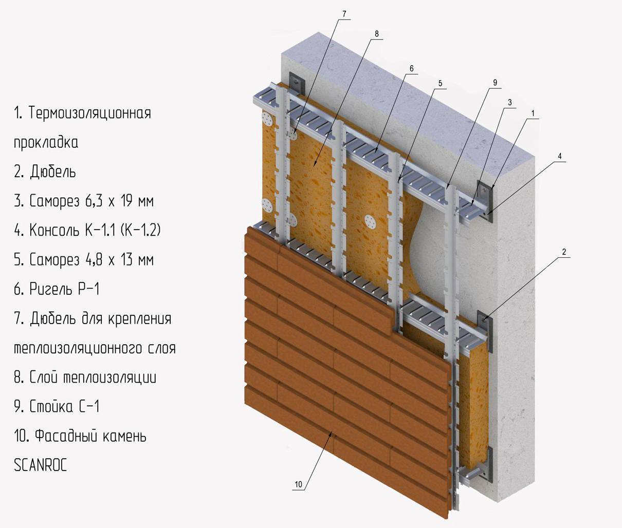 Для обустройства каркаса, на который монтируется отделочный материал, следует использовать деревянный брус сечением 4х5, 5х5. Чтобы создать рекомендуемую величину вентиляционного зазора в 4-5см, следует использовать контр рейку из того же бруса. Вентилируемый фасад предполагает наличие отверстий, закрытых решетками, которые обеспечивают свободное поступление воздуха.