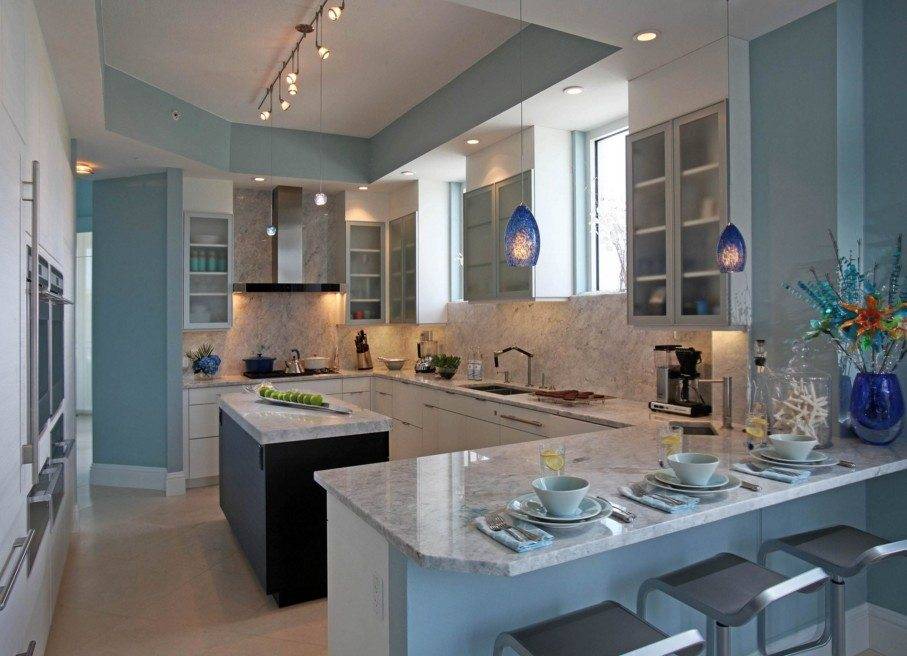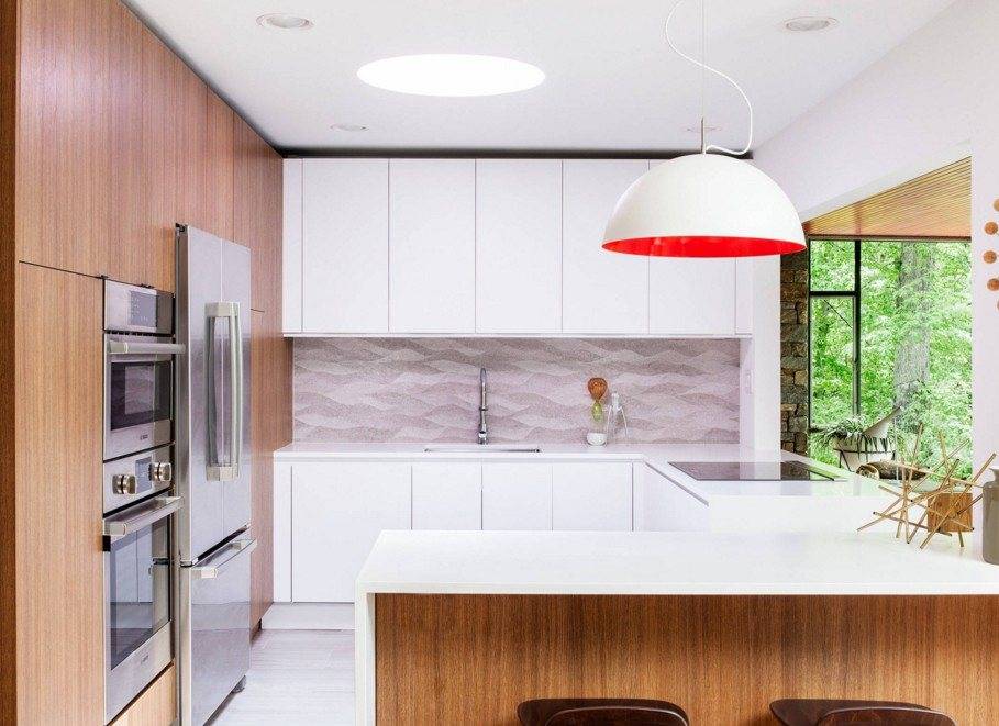Еще одно достоинство, которое стоит отметить – это простота монтажа. Когда плитка требует навыков по укладке, подготовки стен, пластик можно установить за несколько часов. Современные кухонные панели из пластика могут быть не только стандартного белоснежного цвета, но и иметь глянцевый блеск, фактурные рисунки и броские расцветки. На фото ниже вы можете посмотреть на интерьер кухни, где стены отделаны пластиковыми панелями.