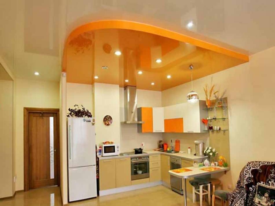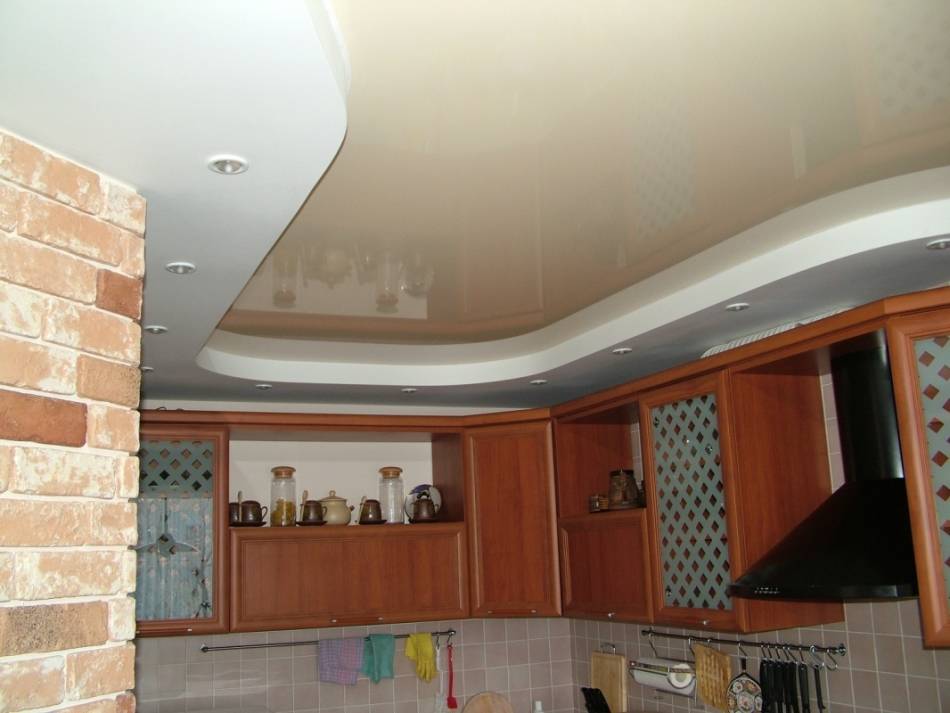 - Одноуровневый вариант самый простой. Пленка или ткань натягивается по всей площади кухни, формируя тем самым идеально ровную поверхность. Результат получается очень аккуратным и эстетичным, а процедура монтажа осуществляется довольно просто.
