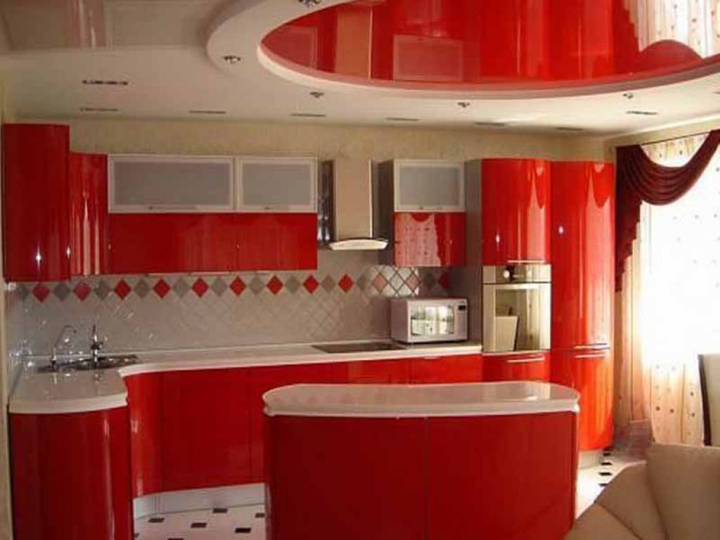 Двухъярусная конструкция предполагает использование смелых цветовых комбинаций. Яркий холодильник и кухонная мебель насыщенной расцветки отлично гармонирует с глянцевым потолком такого же цвета.