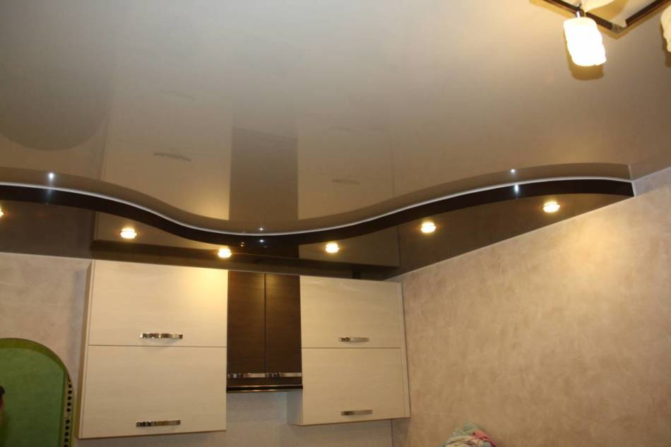 При желании использовать глянцевую поверхность в большом помещении, сделайте двухуровневый потолок. Таким образом, для устройства понадобятся небольшие фрагменты винила, а количество стыковочных швов будет минимальным.