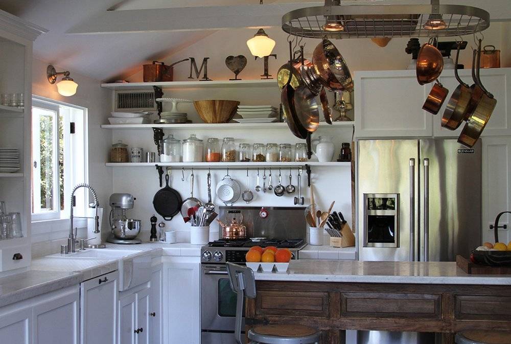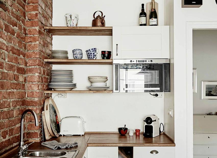 Больше всего открытые полки на стену подойдут для интерьеров кухни, оформленных в стиле прованс, кантри, лофт, скандинавский. В квартирах со свободной планировкой, где кухонная зона совмещена с гостиной, полочки на стене отлично сочетаются с этажерками для книг, делая интерьер единым по стилю.