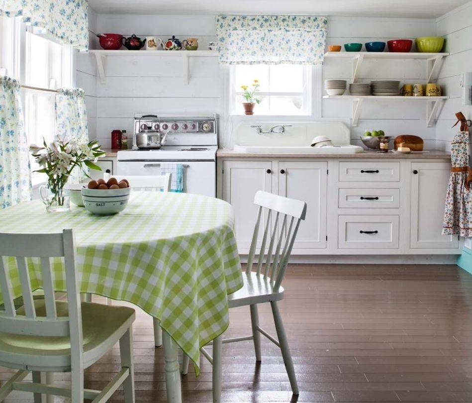 Отличным решением станет декорирование отдельных открытых полок с цветочным рисунком. Во-первых. Это подчеркнет стилистическую направленность кухни. Во-вторых, это решение предотвратит содержимое полок от внешнего загрязнения. В-третьих, позволит вам поэкспериментировать: в одних случаях вы можете держать шторки занавешенными, в других – открытыми. Главное – соблюдать чувство меры.Наиболее оптимально украсить занавесками только пару полок.