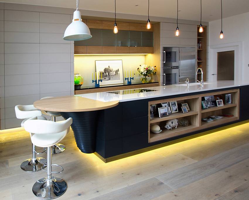 Способствуют визуальному расширению помещения и делают его намного свободнее. Однако содержимое открытых конструкций, постоянно требует идеального порядка и частой уборки. В данном случае, чтобы уход был менее трудоемким, рекомендуется установка более мощной вытяжки.