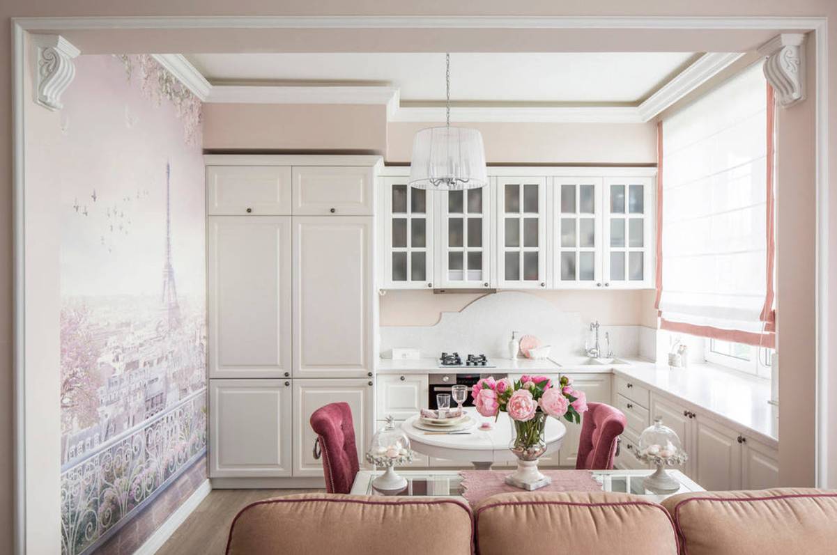 Бежевая гамма подойдёт провансу и кантри. В первом случае в таких оттенках могут быть выполнены одновременно гарнитур и отделка стен. В качестве акцента подойдёт текстиль розовых, лавандовых, жёлтых, голубых, терракотовых тонов.