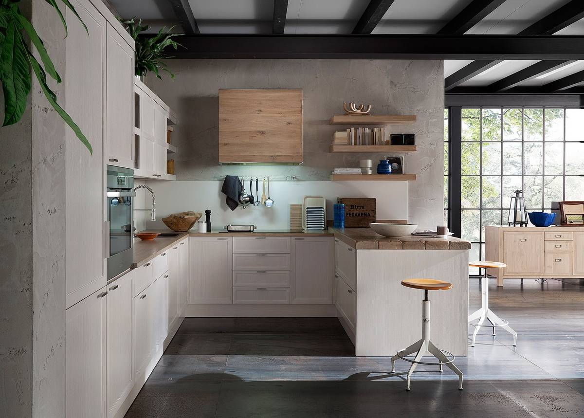 Еще один современный взгляд на классику. Традиционный дизайн вытяжки с фасадами с рамками и панелями серого цвета идеально впишется в просторную П-образную или островную кухню.