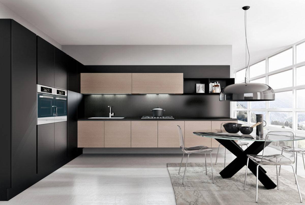 Элегантный вариант, адаптируемый для разных стилей от классики до лофта. Благородные бежевые тона оттенят строгий графичный чёрный гарнитур.