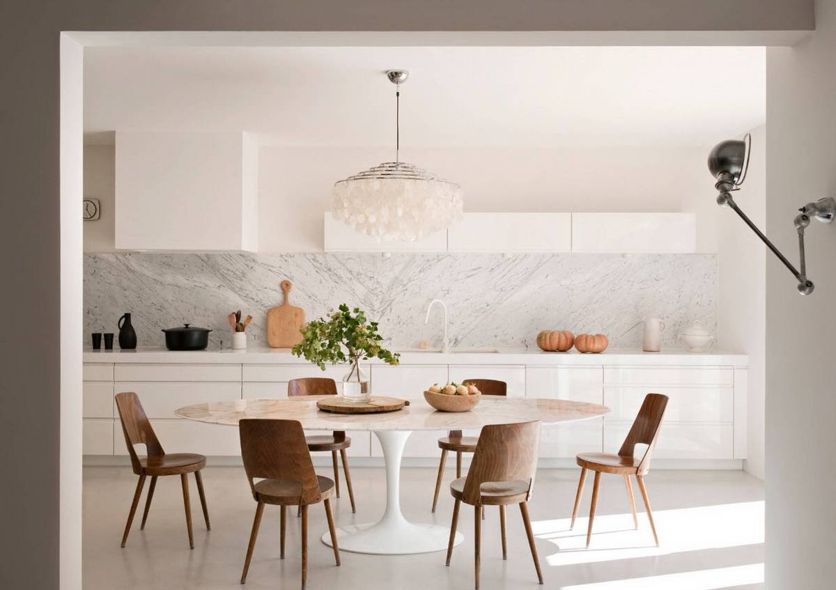 Подобному цветовому решению подходят креативные, притягивающие взор предметы чёрного цвета – к примеру, меловая доска или стулья со спинками, оплетёнными чёрной «паутинкой».