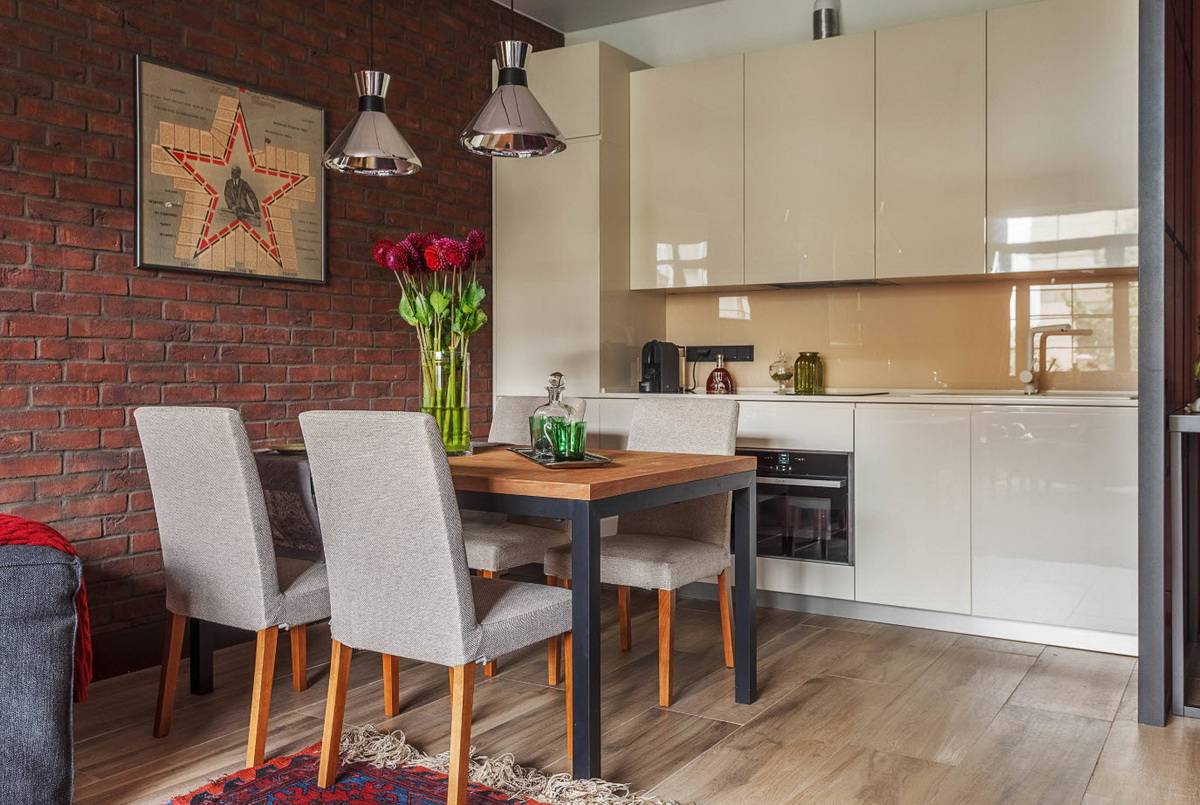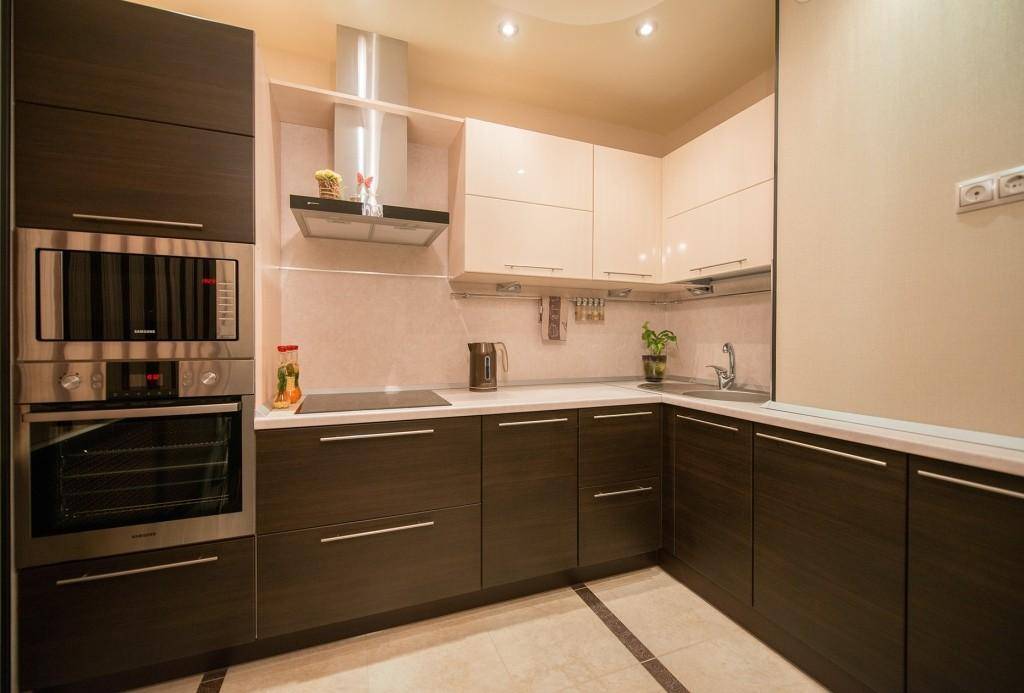 Бежевый и белый (не глянцевый). Эти цвета считаются родственными. Они удачно используются между собой при оформлении небольших по площади кухонь. Визуально подобный союз характеризуется прохладой и воздушностью. Хотя такая комбинация не очень практична в плане ухода. Серый и бежевый — отличный вариант для кухни. Предпочтительно использовать серый тон для отделки поверхностей, в то время как мебель стараются устанавливать именно с бежевым фасадом. Бежевый и коричневый — снова родственные оттенки. Такой интерьер приобретает мягкость, сдержанность и изысканность. С использованием заявленных тонов стараются организовывать в помещении идеальную систему освещения. Из-за дефицита света кухня получится мрачной и скучной. Бежевый и черный создают необыкновенный контраст. Темный тон может использоваться для различных элементов, в том числе и столешниц. В некоторых случаях допускается верхнюю часть гарнитура выполнять в подобном стиле, а нижнюю — в бежевом. Допускается расположение контрастных объектов в хаотичном порядке. Бежевый и салатовый. Обстановка в такой кухне становится весенней и веселой
