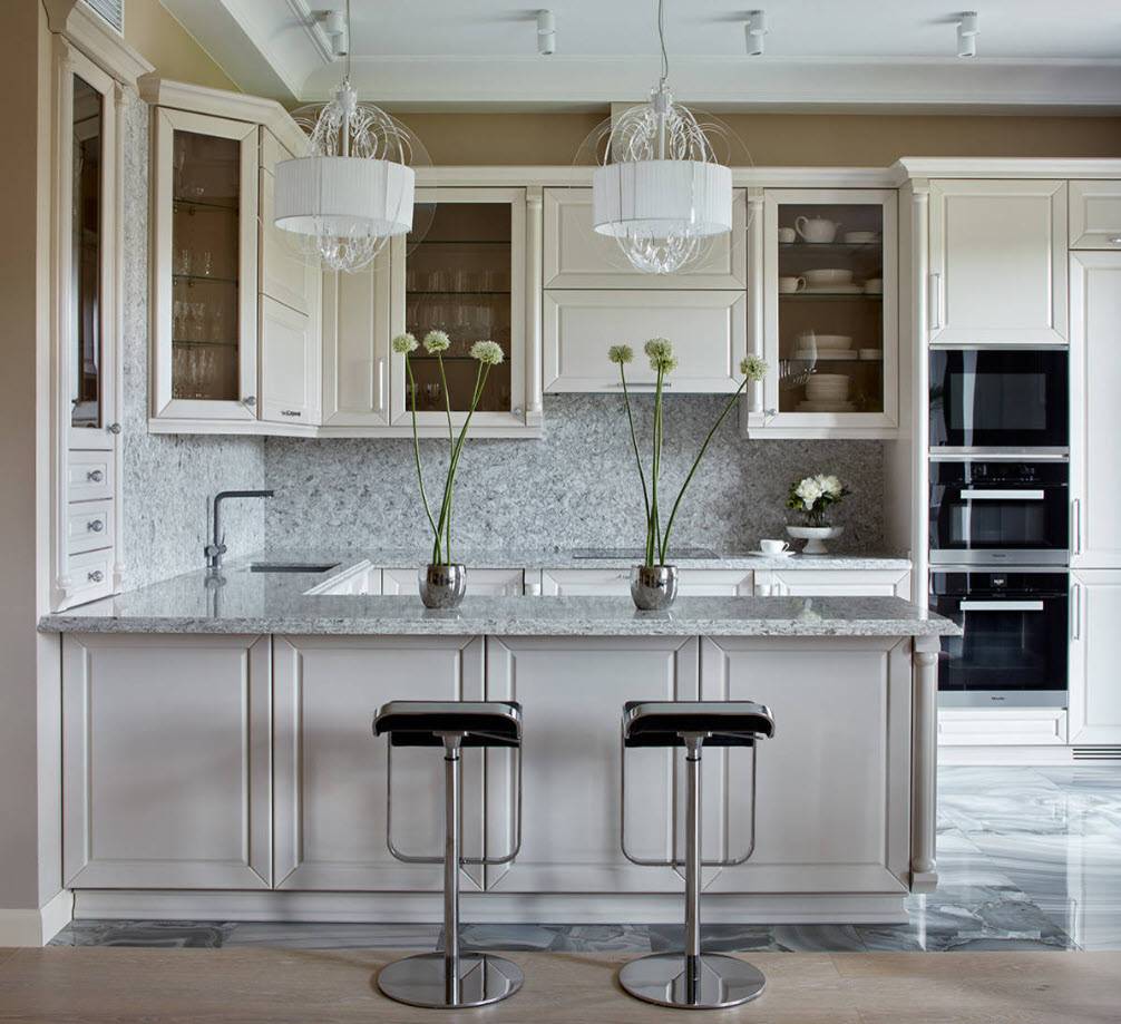 Выдержанные серые тона и классика — верные спутники. Для этого стиля интерьера характерна роскошная мебель, мягкое освещение, украшения из драгоценных металлов и преобладание геометрических форм мебели. Такой блеск будет безупречно и оригинально смотреться на фоне гранита или серо-голубого цвета.
