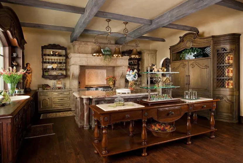 Главное украшение комнаты в стиле кантри – большой камин. Он редко встречается на кухне, но будет уместен в просторной совмещенной кухне-гостиной с отдельной обеденной зоной