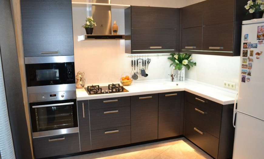 Сразу стоит сказать, что для современной кухни, особенно с небольшой площадью, лучше выбирать бытовую технику встроенного типа. Если в квартире проживает 1-2 человека и есть мультиварка, то можно установить врезную, электрическую или газовую, варочную панель на две конфорки. Духовой шкаф можно вынести наверх между столешницей и навесным модулем. Так освободится место для хранения в тумбе под варочной поверхностью.