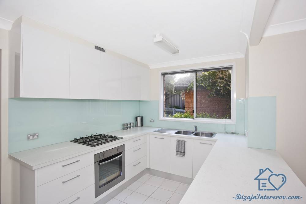 Фартук может быть отдельным акцентом для белого гарнитура или же дополнять столешницу в тон. Совсем необязательно выполнять его из массива — из соображений практичности. Вполне можно поискать замену, например:
