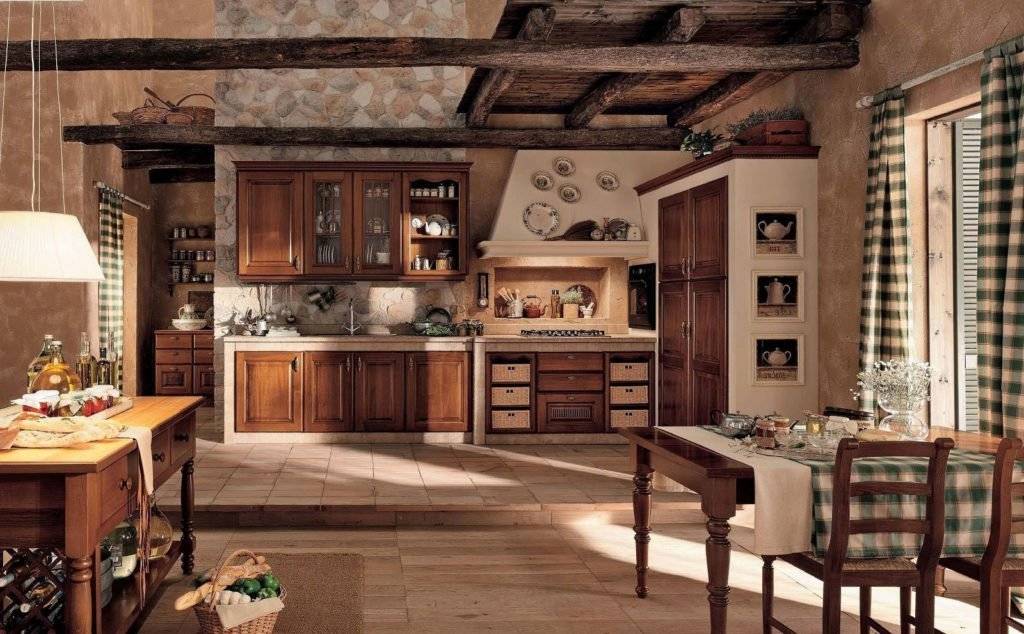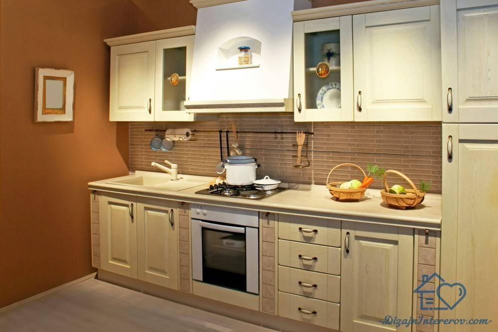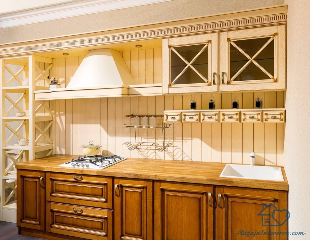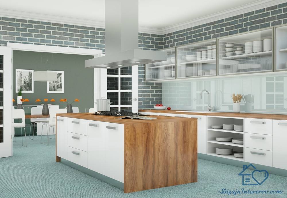 Это решение подойдет для более просторных кухонь, поскольку «деревянные» верхние шкафы могут зрительно сужать пространство. По этой причине лучше остановиться на белом цвете стен и тщательно продумать освещение, чтобы кухня была буквально наполнена светом.