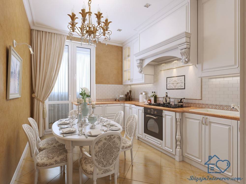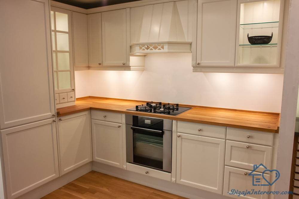 В классическом стиле белая кухня с деревянной столешницей смотрится изысканно в сочетании с массой привлекательных деталей, которые создадут общую картину интерьера